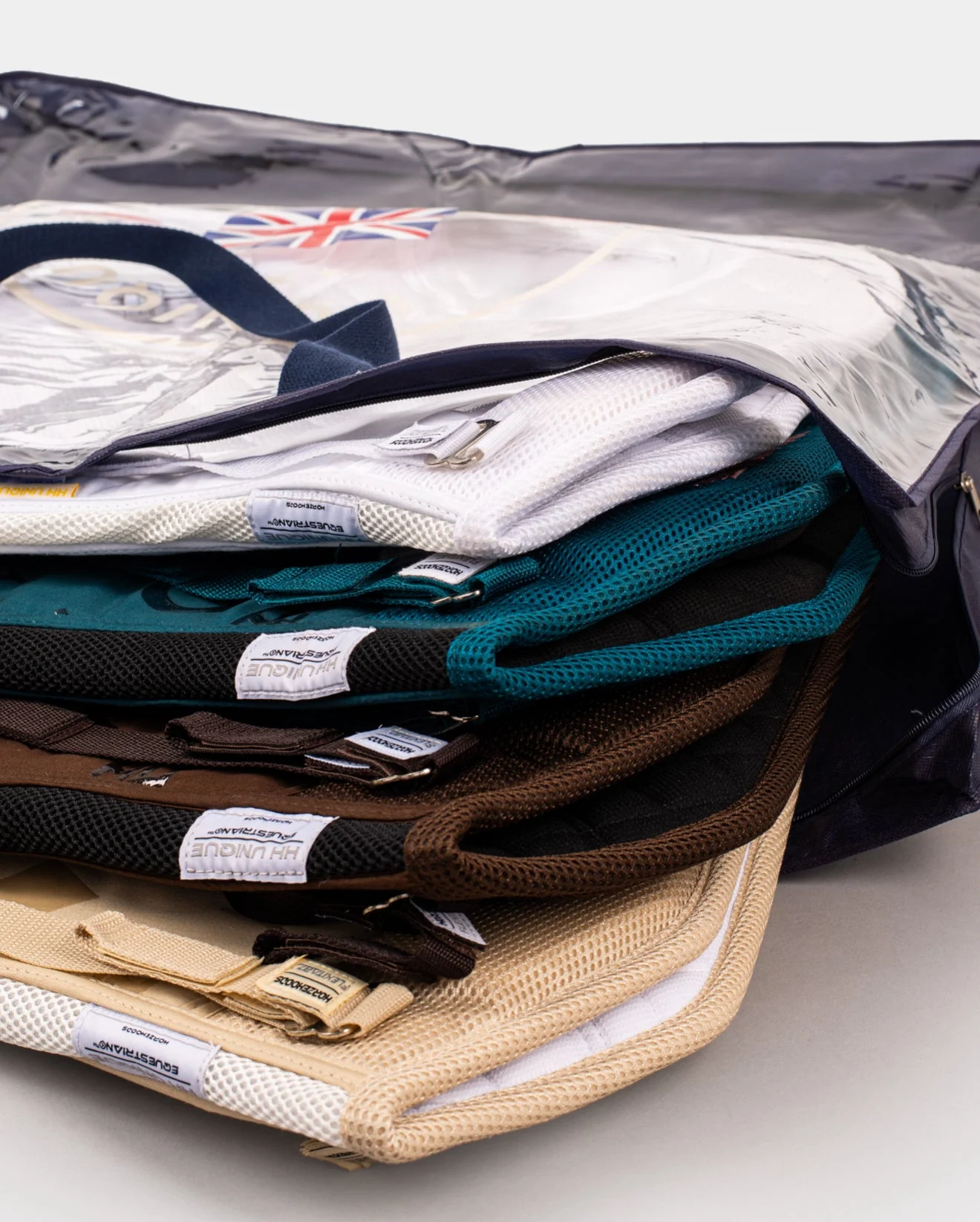 With a generous capacity, it comfortably fits up to 10 saddle pads, with additional space for bandages, boots, and essential tack. The full zip fastening keeps contents secure, while the transparent outer allows you to see what’s inside at a glance.